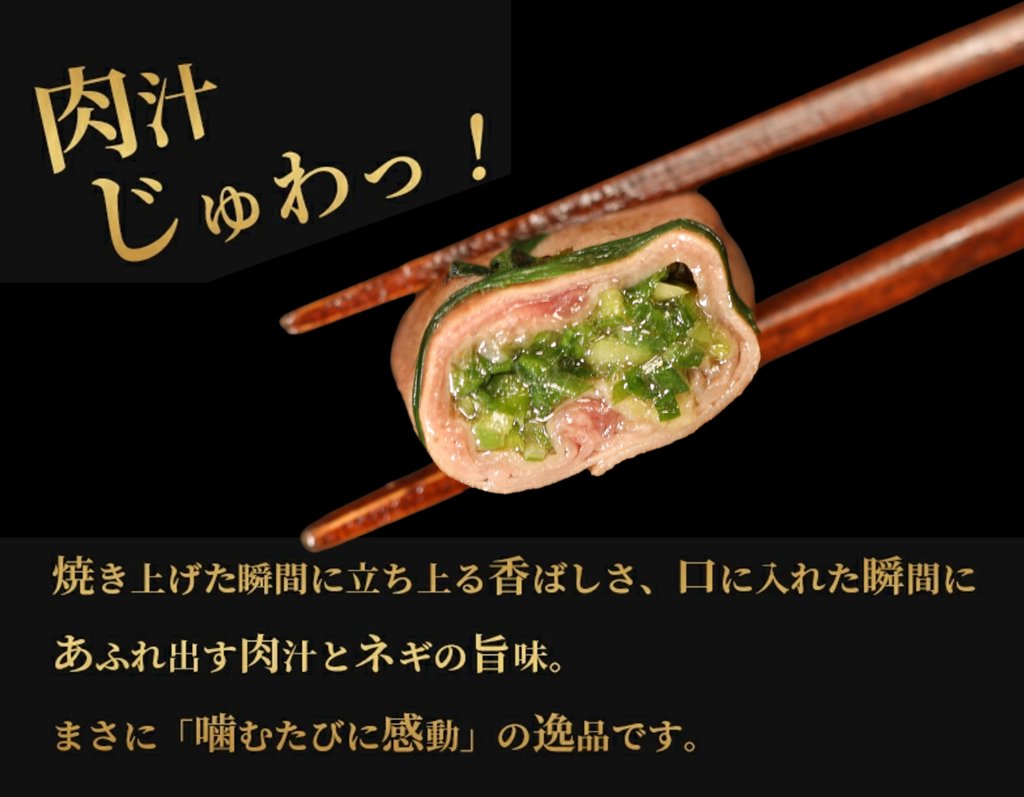 味付けしたネギを牛タンで包みこみ、焼いたときに中のネギがこぼれず口に入れたときあふれ出す肉汁とネギの食感がたまらない至極の逸品です。